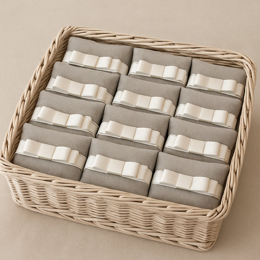 Grey Cotton Sachet 10.5x8 cm with Ivory Satin Bow Complete with Lastminute Promo packaging