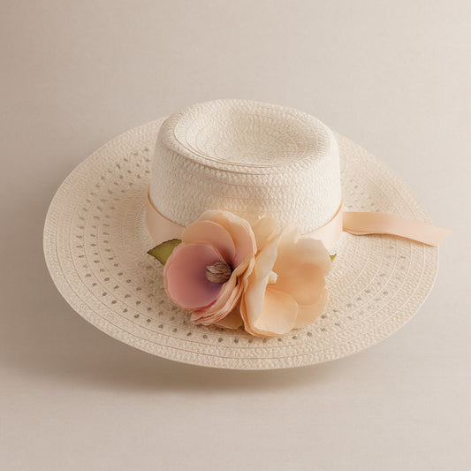 Onde Creazioni Cappello Paglia Sintetica con Nastro Cipria e Fiori in Tessuto Ø 40 cm