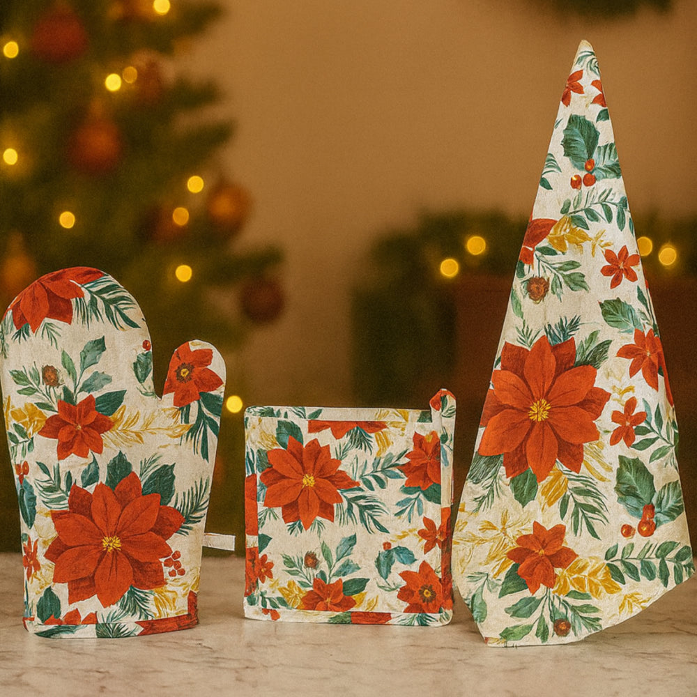 Un coordinato completo e raffinato per una cucina sempre curata: il set Babbomatto comprende un guanto forno, due presine e un canovaccio in cotone 100%. Funzionalità e stile si incontrano in questo kit pensato per chi ama la qualità dei materiali naturali e l’armonia dei dettagli.