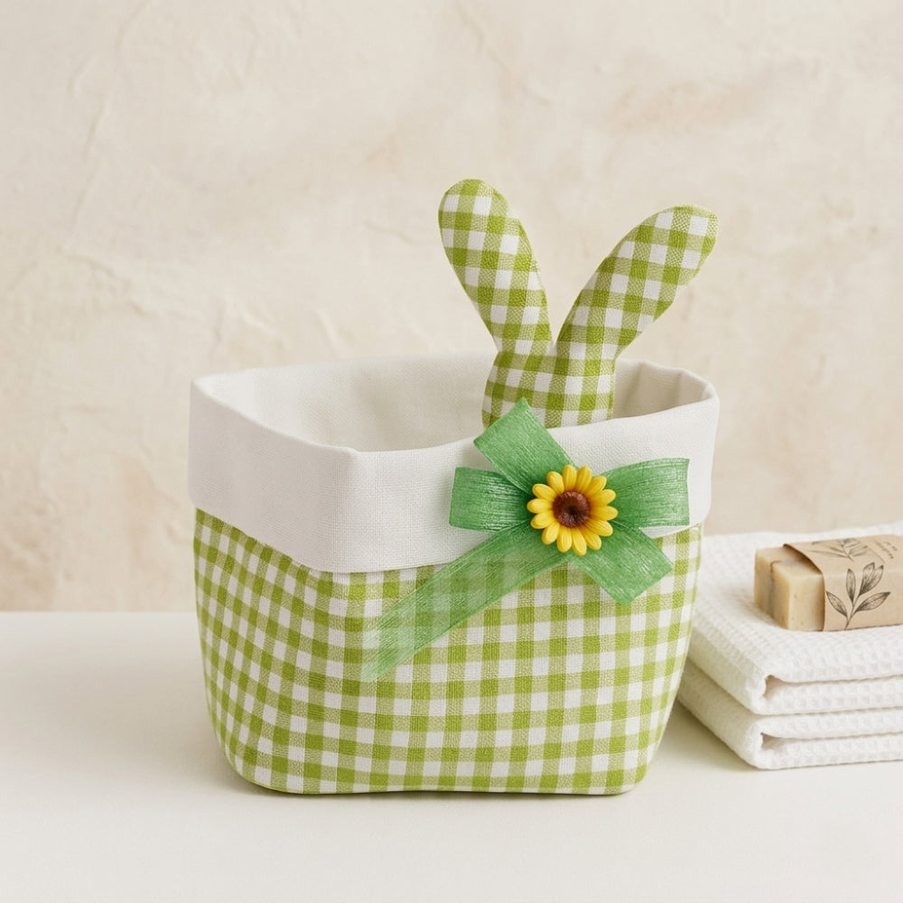 Questo tenero Cestino Porta Pane in cotone, impreziosito da un simpatico coniglietto decorativo, è perfetto per portare in tavola un tocco di dolcezza e allegria durante le festività pasquali. Realizzato con materiali morbidi e di qualità, unisce funzionalità ed estetica artigianale.